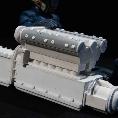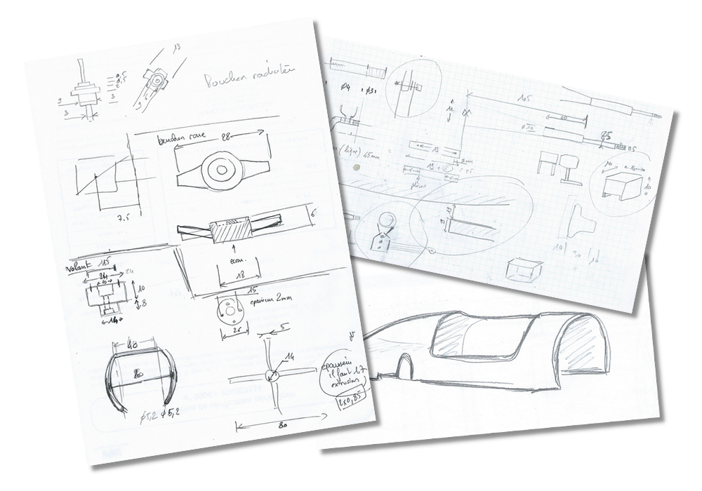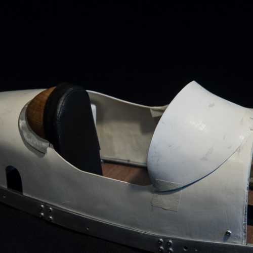 Peinture du moteur. Réalisation du master de la carrosserie en polystyrène. Réalisation de la carrosserie en fibre de verre.