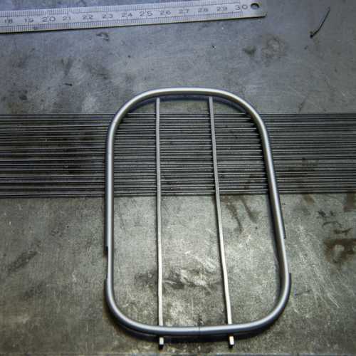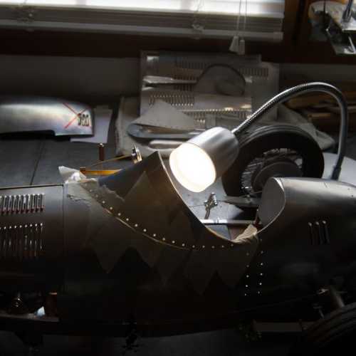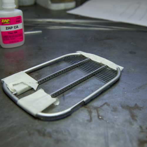 Réalisation de la carrosserie partie avant (alu), de la calandre (alu pour le cadre et corde à piano pour la "grille)