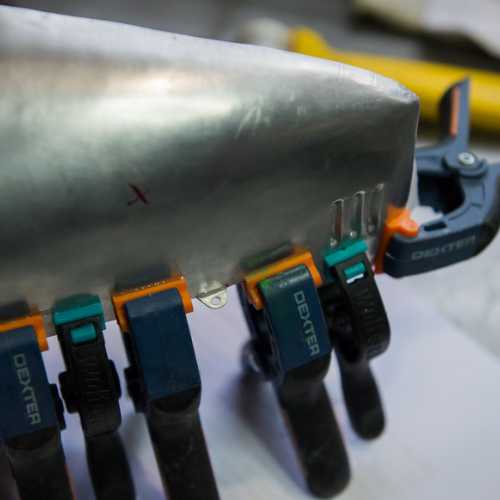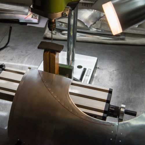 Présentation du déflecteur d'air, repérage des trous des rivets par transparence, pointage et perçage.