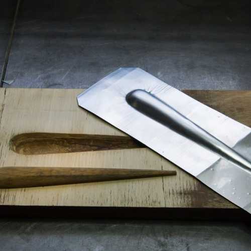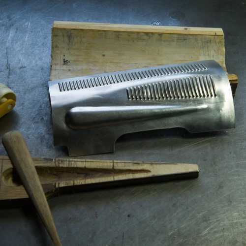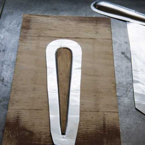 Afin de rendre "malléable" l'aluminium, on trace des trais au savon noir dessus, on chauffe l'ensemble de la plaque à 650°C et lorsque le savon brunit, l'aluminium est à la bonne température pour être trempé. Il est ensuite mis dans le moule et l'ensemble sous presse.