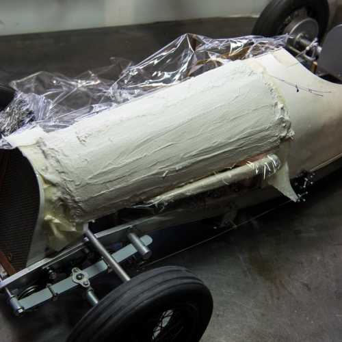 Peinture du moteur. Réalisation du master de la carrosserie en polystyrène. Réalisation de la carrosserie en fibre de verre.