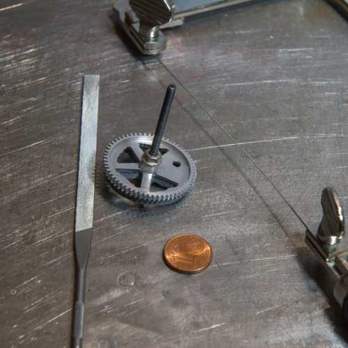 Fabrication des fusées de roue. Utilisation d'une fraise à bout hémisphérique pour réaliser la gorge recevant le tube, puis rainurage pour positionner les bras de direction. L'ensemble est soudé à l'étain.