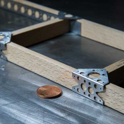 Fabrication d'une série de tôles pour l'assemblage du châssis. Principe d'assemblage équerres / châssis. Collage du châssis