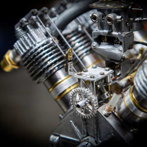 Prototype d'un cylindre. Fabrication des rondelles pour les ailettes de refroidissement dans une tôle grossièrement découpée puis passée au tour. La suite est un empilement des rondelles de différentes sections et épaisseurs. Fabrication de l'embase du cylindre. Perçage des ailettes et mise en place de la partie recevant la bougie .Beaucoup d'heures plus tard, les 8 cylindres sont prêts pour assemblage. 8 cylindres, 7 ailettes de refroidissement / cylindre , 23 trous /ailette = 1288 trous ;o)